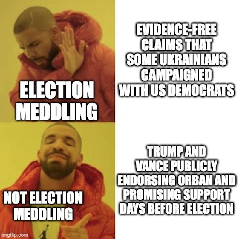 «Втручання у вибори: безпідставні твердження, що деякі українці брали участь у передвиборчій кампанії з американськими демократами. Не втручання у вибори: Трамп і Венс публічно підтримують Орбана і висловлюють підтримку за кілька днів до виборів», — йдеться на ілюстрації.